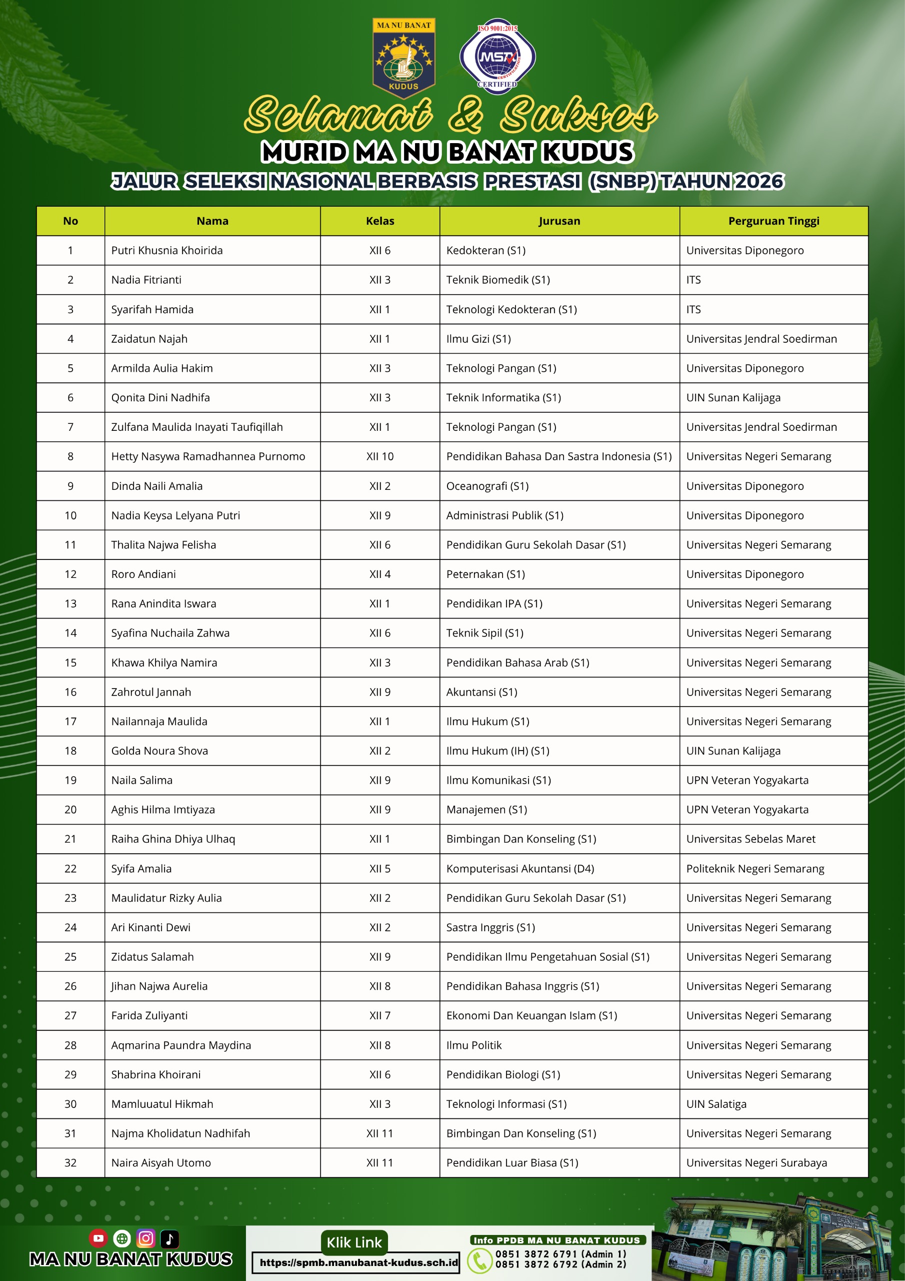 Daftar Murid MA NU Banat Kudus yang Lolos SNBP Tahun 2026